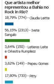 Lá atrás, bem longe, aparece a rival loira de Ivete, Claudia Leitte, com 18,79% da preferência (774 sufrágios), seguida de perto pela roqueira Pitty, com 17,80% dos apoios (733). A excelente Orkestra Rumpilezz, liderada pelo maestro Letieres Leite, não empolgou os votantes e marcou somente 150 votos (3,64%), um a mais que o velho baiano Pepeu Gomes, com 149 (3,62%)